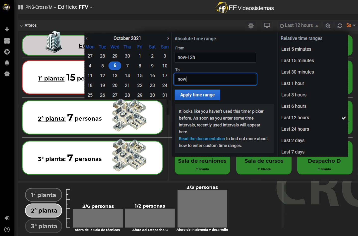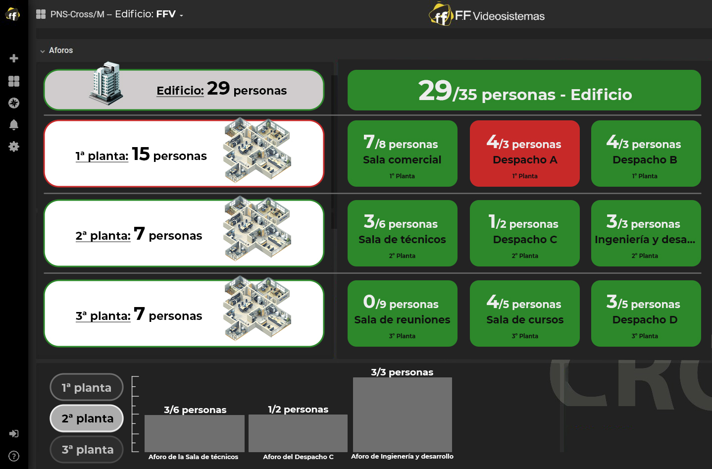 - Monitorización en tiempo real: Dispone de una interfaz con paneles y gráficos claros y sencillos con un sistema de códigos de colores para reconocer el nivel de ocupación de forma rápida. |